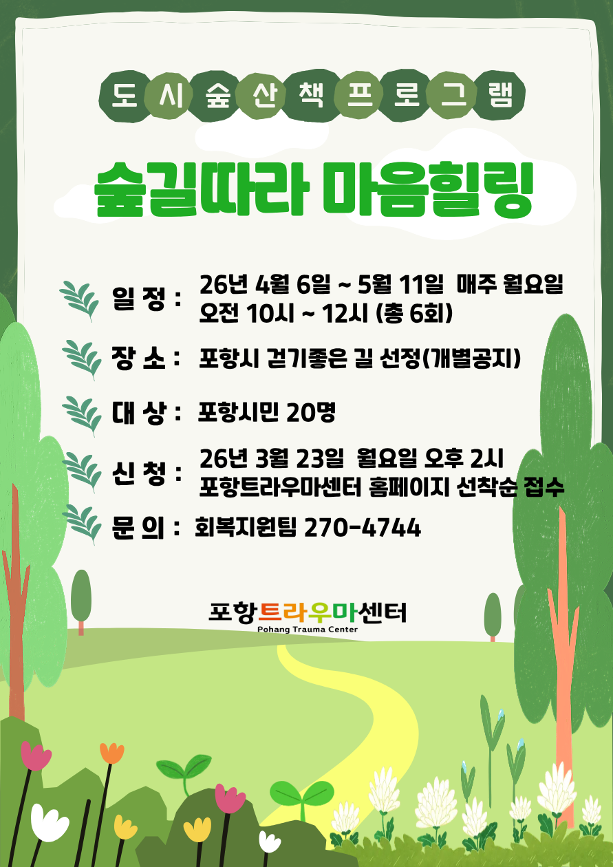 26년 함께 걷는 도시 숲 산책「숲길따라 마음힐링」참여자 모집에 많은 관심과 참여 부탁드립니다.♥